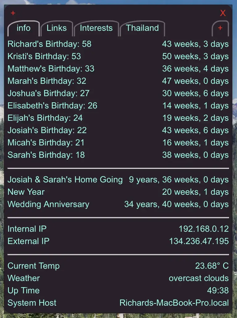 ScriptBar é um programa que mostra a saída dos scripts ou o servidor Node-Red. Ele executa scripts definidos no programa EmailIt e mostra a saída. Scripts de xBar ou TextBar podem ser usados, mas atualmente em scripts da TextBar funcionam bem. Também exibe a saída de scripts no seu sistema. ScriptBar não os coloca na barra de menus, mas os tenha todos em uma janela convidada para fácil visualização. Você pode ter várias abas para ter muitas coisas diferentes mostradas. Você também pode manter os links para os sites mais visitados.